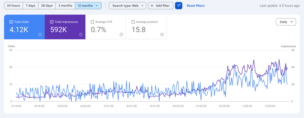 The screenshot above shows real 12-month Google Search Console results from one of our clients. Notice how both clicks and impressions trend upward over time, especially in the later months. That’s the compound effect of a consistent SEO workflow process in action.