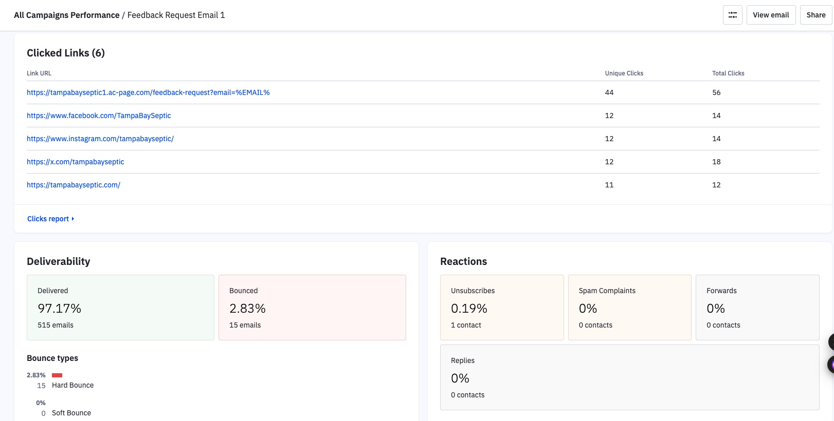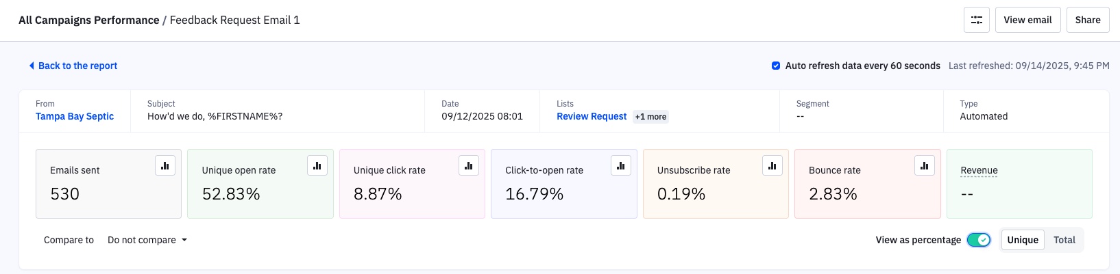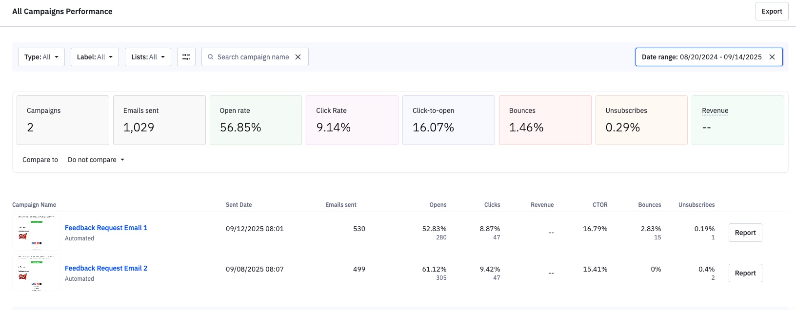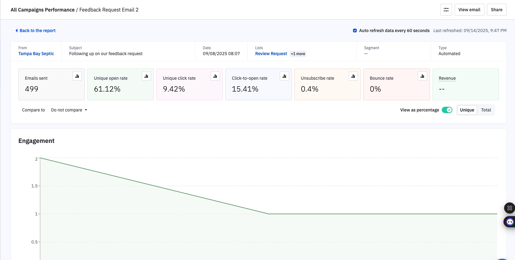 - Consistent engagement across over 1,000 review request emails with open rates above 56%.